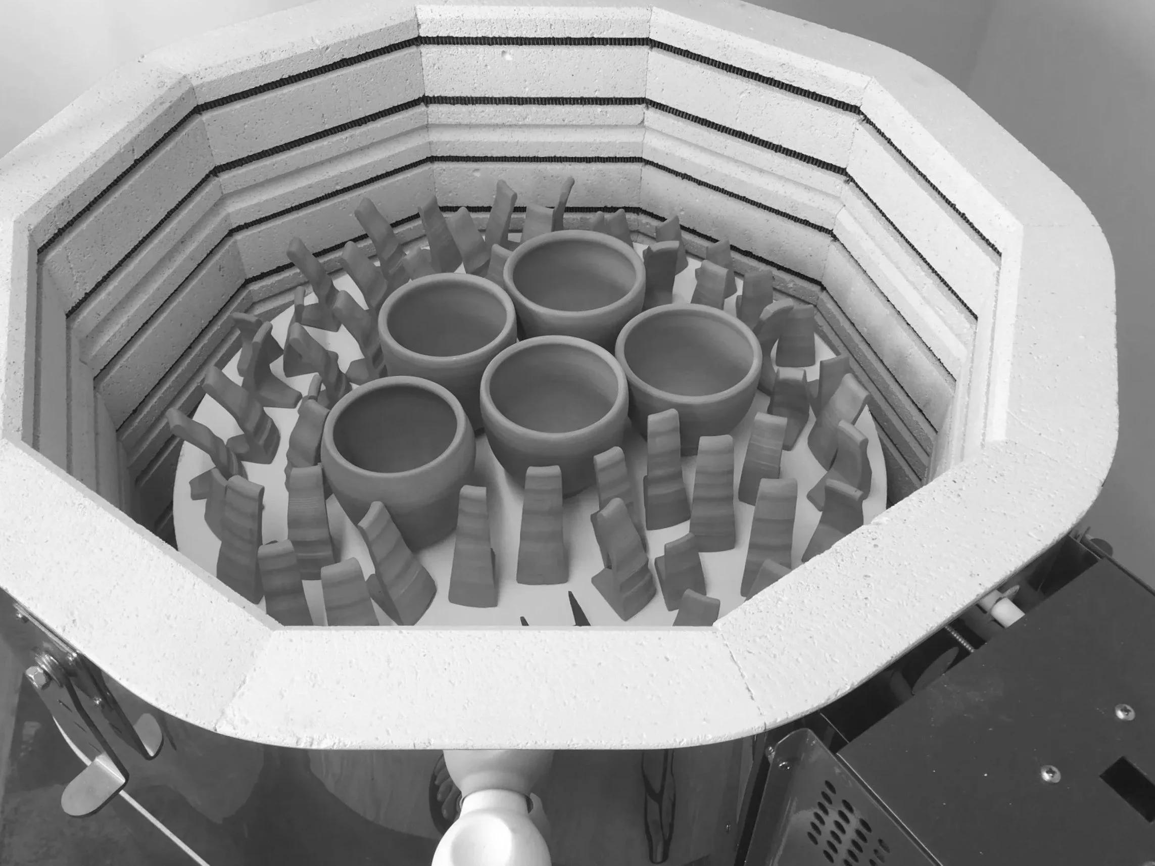 We fire stoneware clay to cone 04 / 1062c for bisque, and to cone 6 / 1222c, or cone 9/10 (whole kiln load only) for glaze.